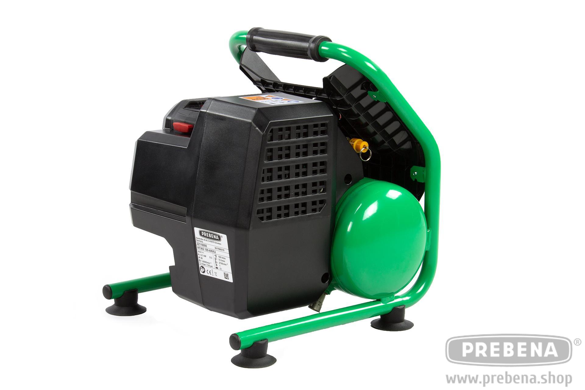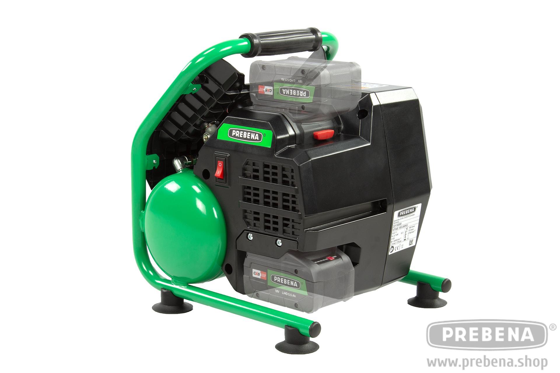 Akku-Kompressor mit hocheffizienten bürstenlosen Gleichstrommotor inkl. Akku18-5,5 LiHD und Ladestation Akku-Station 12-36. Druckluft für unterwegs: Der leichte und kompakte VITAS 100-AKKU 18-Volt-Akku-Kompressor mit Brushless-Motor und einem Maximaldruck von acht bar ist der perfekte Begleiter auf der Baustelle oder in der Werkstatt. Mit einem Gewicht von rund zehn Kilogramm und einer Größe von 330x310x390 Millimetern ist er einfach zu transportieren und steht mit seinen gummierten Standfüßen zu jeder Zeit sicher. In Kombination mit den PREBENA Druckluft-Werkzeugen ist der ölfreie Kolbenkompressor ideal für Arbeiten im Innenausbau, bei der Holzbearbeitung und im Sanitärbereich geeignet. Manometer für Kessel- und Ausgangsdruck und eine Universalkupplung für alle gängigen Anschlusssysteme garantieren eine einfache Bedienung. Ölfrei: kein Ölwechsel, kein Öl im Kondenswasser Integriertes Ablagefach für einen Wechselakku zum Weiterarbeiten ohne Unterbrechung Leicht und leistungsstark Laufzeit mit AKKU18-5,5-LiHD: ca. 60 Minuten Brushless Motor für den optimalen Einsatz im Innenausbau und auf Baustellen Lieferumfang 1 Stk. VITAS 100-AKKU im transportgerechten Versandkarton 1 Stk. Akku18-5,5-LiHD Hochleistungsakku 5,5 AH 18 V 1 Stk. Akku-Station 12-36 AKKU im Lieferumfang enthalten! Zusätzliche passende Akkus finden Sie hier: Zu den Akkus