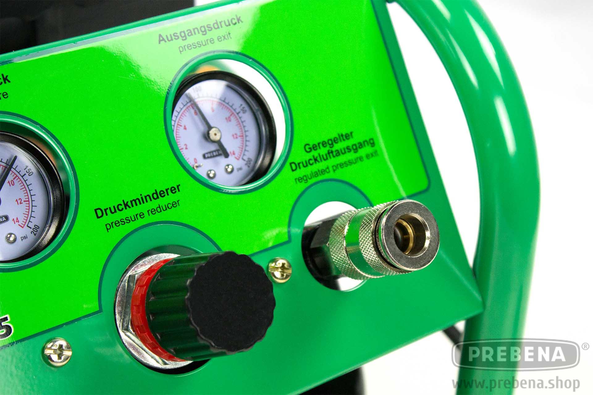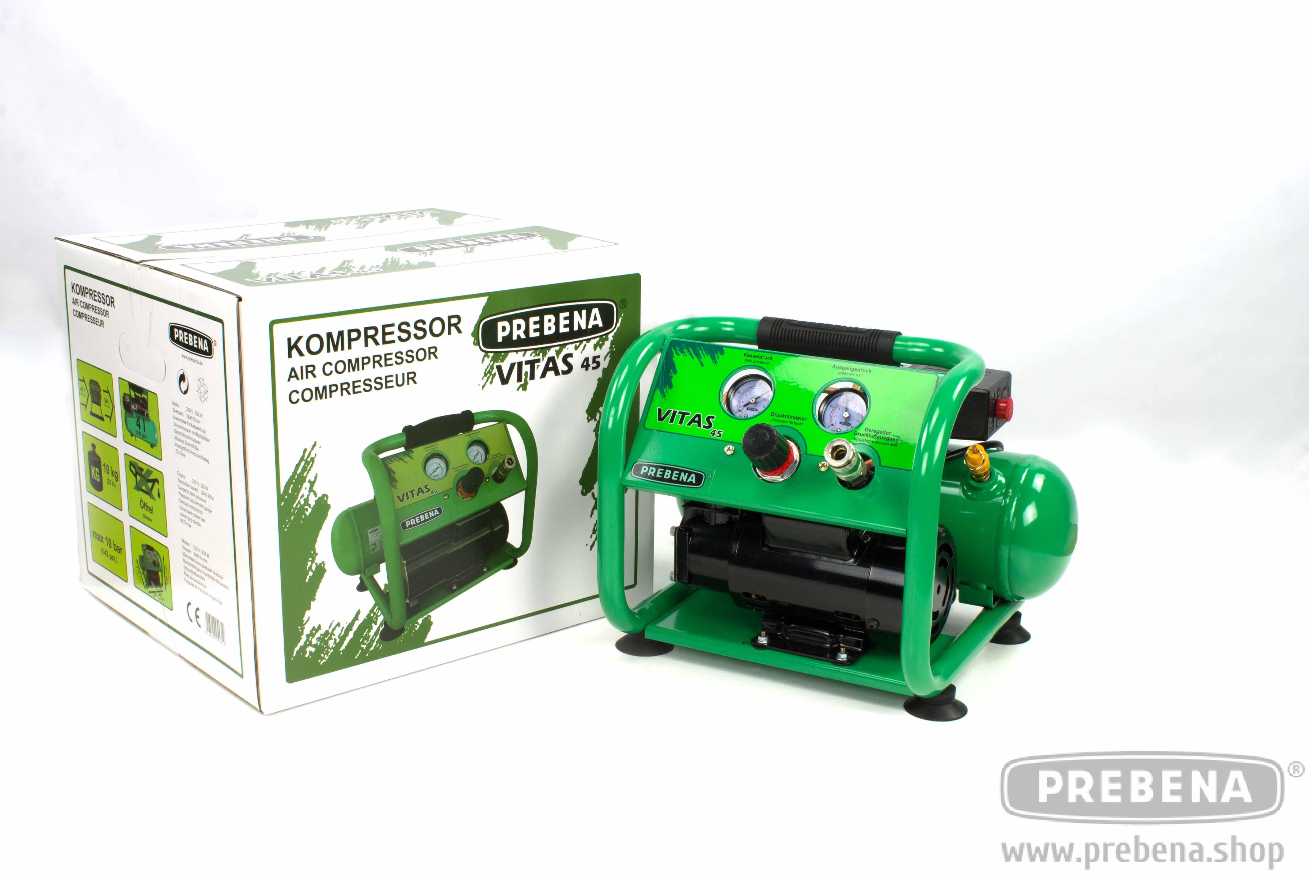 Der PREBENA VITAS 45 Kompressor besticht sowohl durch seine robuste Bauweise, sowie durch sein kraftvolles ölfreies Aggregat. Durch seine geschützten Armaturen und den gummiertem Handgriff ist das Gerät ideal für den Transport geeignet. Durch die kompakte Bauweise lässt sich der Kompressor problemlos unter jeder Werkbank, sowie im Kofferraum verstauen. Das ölfreie Aggregat ist wartungsarm und sorgt für eine ölfreie Druckluft. Mit einem maximalen Druck von 10 bar und dem regulierbaren Druckminderer ist der PREBENA VITAS 45 Kompressor sowohl für den Heim & Hobby Einsatz, als auch für den Profi-Bereich die ideale Wahl.